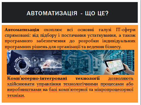 Основною перевагою випускників спеціальності « Автоматизація та комп’ютерно-інтегровані технології» є засвоєння ними найбільш широкого спектру технічних знань: від спеціальних розділів математики та фізики, присвячених системам автоматичного керування та контролю, до загальної теорії систем. Студенти отримують знання, які визначаються сучасною тенденцією розвитку – впровадженням комп’ютерних систем автоматики і управління у всіх галузях техніки та технологій, а саме промислового виробництва, транспорту, зв’язку, комунального господарства, енергетики та ін. Фахівці мають високий рівень комп’ютерної, електротехнічної та системотехнічної підготовки, здатні вирішувати задачі автоматизації діючого виробництва і створення нових систем автоматизації на базі інформаційних технологій.