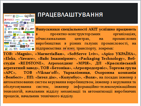 Особливим попитом випускники користуються на підприємствах, які займаються розробкою програмного забезпечення комп’ютерної та мікропроцесорної техніки, систем зв’язку, програмно-апаратних комплексів.