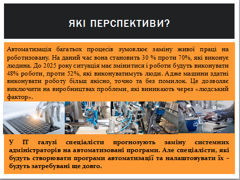 У ІТ галузі спеціалісти прогнозують заміну системних адміністраторів на автоматизовані програми. Але спеціалісти, які будуть створювати програми автоматизації та налаштовувати їх – будуть затребувані ще довго.